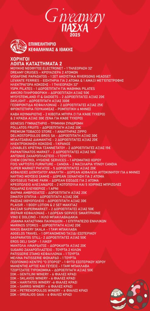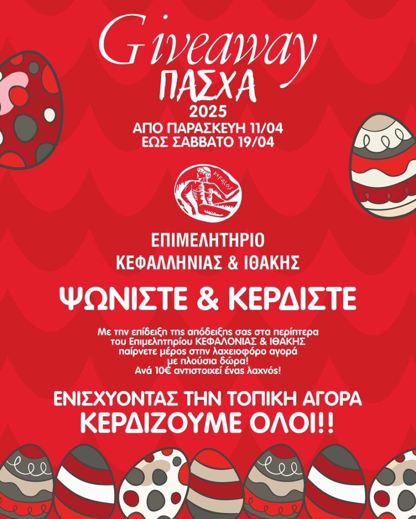 Για αγορές που γίνονται από την Παρασκευή 11 Απριλίου μέχρι και το Σάββατο 19 Απριλίου, προσκόμισε τις αποδείξεις αγορών στα ειδικά περίπτερα του Επιμελητηρίου που θα βρίσκονται στο Λιθόστρωτο Αργοστολίου και την Κεντρική Πλατεία Ληξουρίου, και κέρδισε μία συμμετοχή ανά 10 ευρώ αγορών στην κλήρωση για μεγάλα δώρα! Για την Ιθάκη η συλλογή συμμετοχών στην κλήρωση θα γίνεται στο γραφείο Polyctor Tours πίσω από την κεντρική πλατεία.