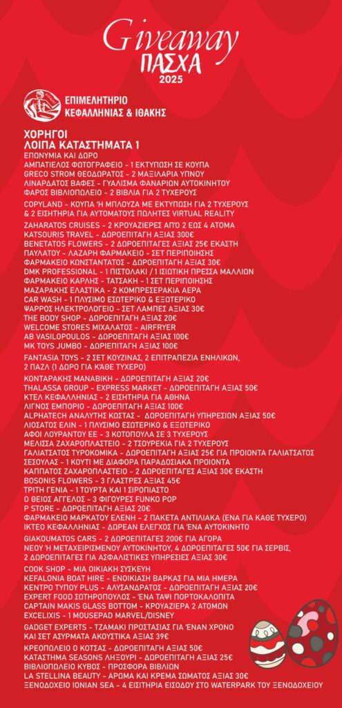 Τονίζεται ότι στη δράση συμμετέχουν αποδείξεις λιανικής από ΟΛΕΣ τις επιχειρήσεις της Κεφαλονιάς και της Ιθάκης ανεξαρτήτως αν βρίσκονται στην κάτωθι λίστα.