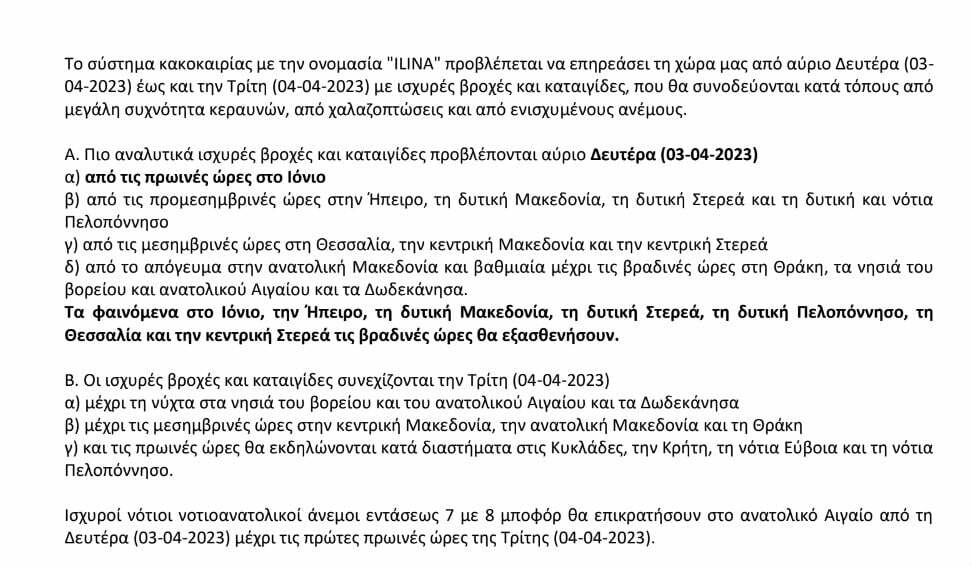 To σύστημα κακοκαιρίας “ILINA” προβλέπεται να μας επηρεάσει από αύριο Δευτέρα 3 έως Τρίτη 4 Απριλίου με ισχυρές βροχές και καταιγίδες