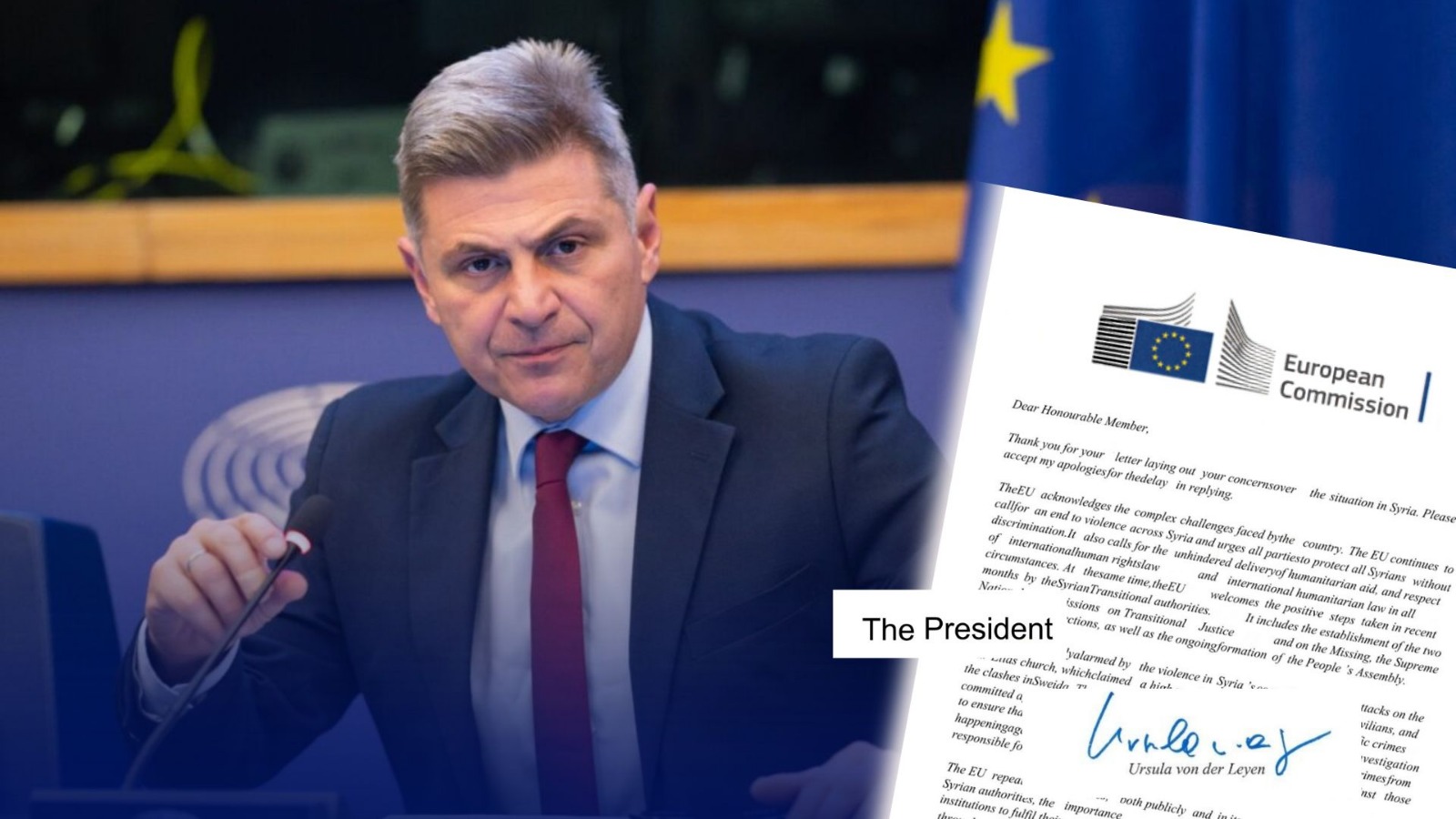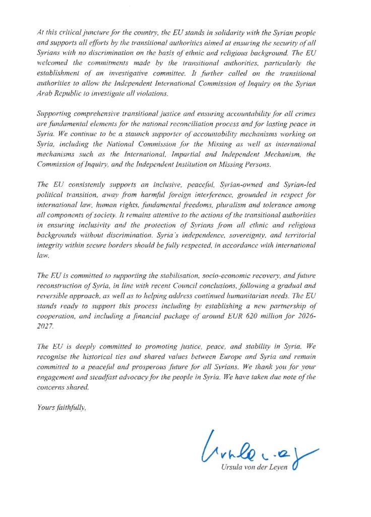 Σε επιβεβαίωση των καταγγελιών του ευρωβουλευτή Νικόλα Φαραντούρη για τις θηριωδίες στη Συρία απ’ το ισλαμιστικό καθεστώς του Αλ Τζολάνι, προχώρησε η Πρόεδρος της Κομισιόν  Ούρσουλα φον ντερ Λάιεν. Σε προσωπική επιστολή της προς τον Έλληνα ευρωβουλευτή, η πρόεδρος της Ευρωπαϊκής Επιτροπής παραδέχεται ότι η κατάσταση έχει επιδεινωθεί με «σφαγές στα παράλια και άλλες πόλεις της Συρίας, περιλαμβανομένης της βομβιστικής επίθεσης στην ορθόδοξη εκκλησία του Προφήτη Ηλία» και με θηριωδίες απέναντι σε εθνικές και θρησκευτικές κοινότητες όπως οι Χριστιανοί, Αλαουίτες, Δρούζοι και Κούρδοι.