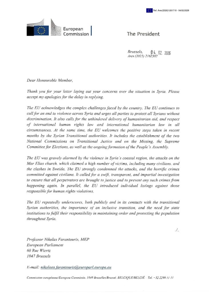 Παράλληλα, υπογραμμίζει ότι η Επιτροπή λαμβάνει πλέον υπόψη της τις ανησυχίες που τέθηκαν στην επιστολή του Νικόλα Φαραντούρη, «αναγνωρίζοντας τη σταθερή και τεκμηριωμένη παρέμβασή του υπέρ του συριακού λαού».